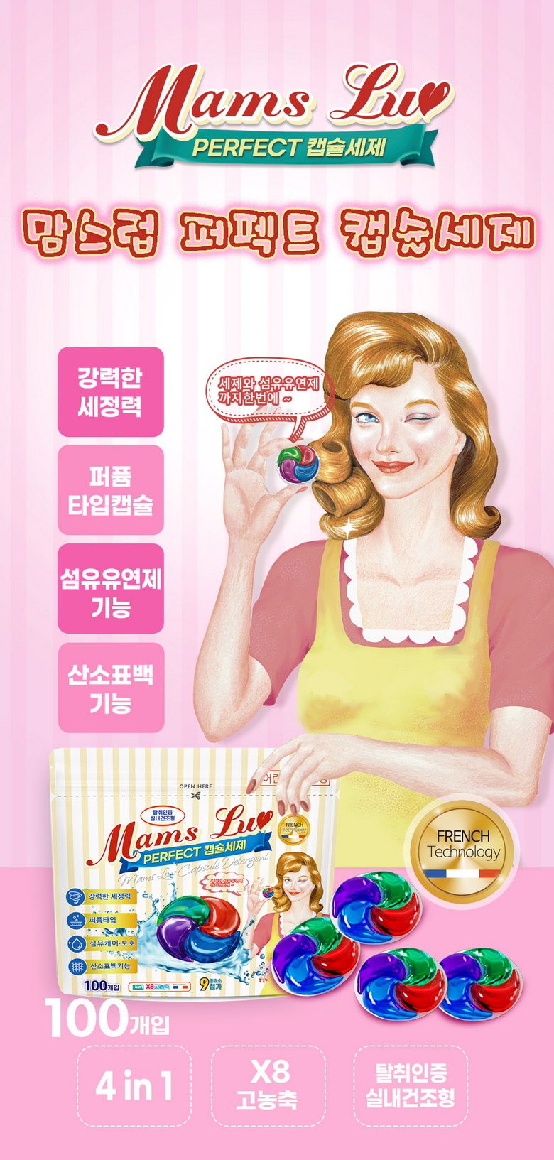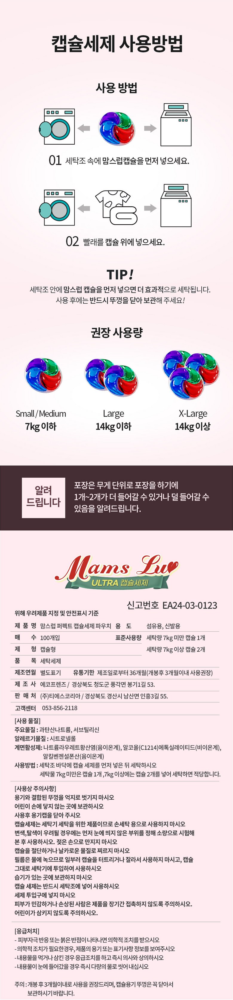 상품명: 맘스럽 퍼팩트 캡슐세제 4챔버 파우치형 국산제조 8배 초고농축 4in1 대용량 실내건조